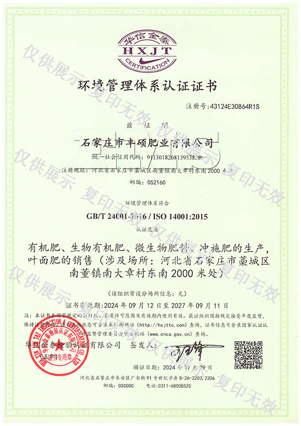 石家莊市豐碩肥業有限公司是一家集新型肥料的研發(fā)、制造、營銷、服務于一體的高新技術企業,公司自2008年創(chuàng)辦以來,一直致力于新型肥料的技術研發(fā)和市場推廣。公司組建了豐碩新型肥料研究中心(院士專家企業工作站),自主知識產權研發(fā)團隊專業科研人員20余人,獲得了多項肥料國家發(fā)明專利。公司目前已擁有發(fā)酵類有機肥、微生物菌劑、生物有機肥、土壤調理劑、大量元素水溶肥、含腐植酸肥料、含氨基酸肥料、中微量元素肥料等8大品類,“金維克”、“豐碩沃農”等2大自有品牌,擁有20多個暢銷品種。目前,我公司已經通過了“ISO9001 質量管理體系認證”、“ISO14001 環(huán)境管理體系認證”、“OHSAS18001 職業健康管理體系認證”。...